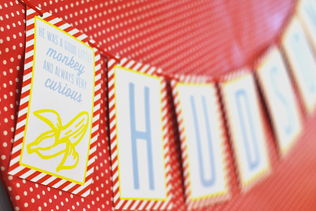 Instead of an invitation featuring an image of Hudson’s beloved ‘Geedge,’ I created a vintage inspired invite with a banana and some super cute diagonal stripes. The text (free vintage fonts from Lost Type Co-Op: http://www.losttype.com/) read “Monkey See- Monkey Do--Curious Hudson is turning two! Let’s Go Bananas!” The invitation stated that guests should RSVP to 'The Mom in the Yellow Hat'-- instead of The Man in the Yellow Hat from the books/show. I also made matching address label wraps to make addressing the envelopes super easy (& adorable!). The back had our address & "Curious Hudson" as the sender.